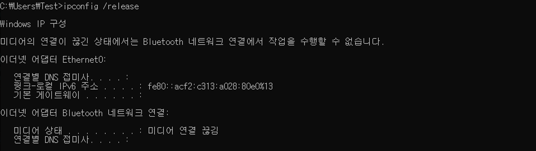 - ipconfig /release 명령어로 기존 IP 초기화