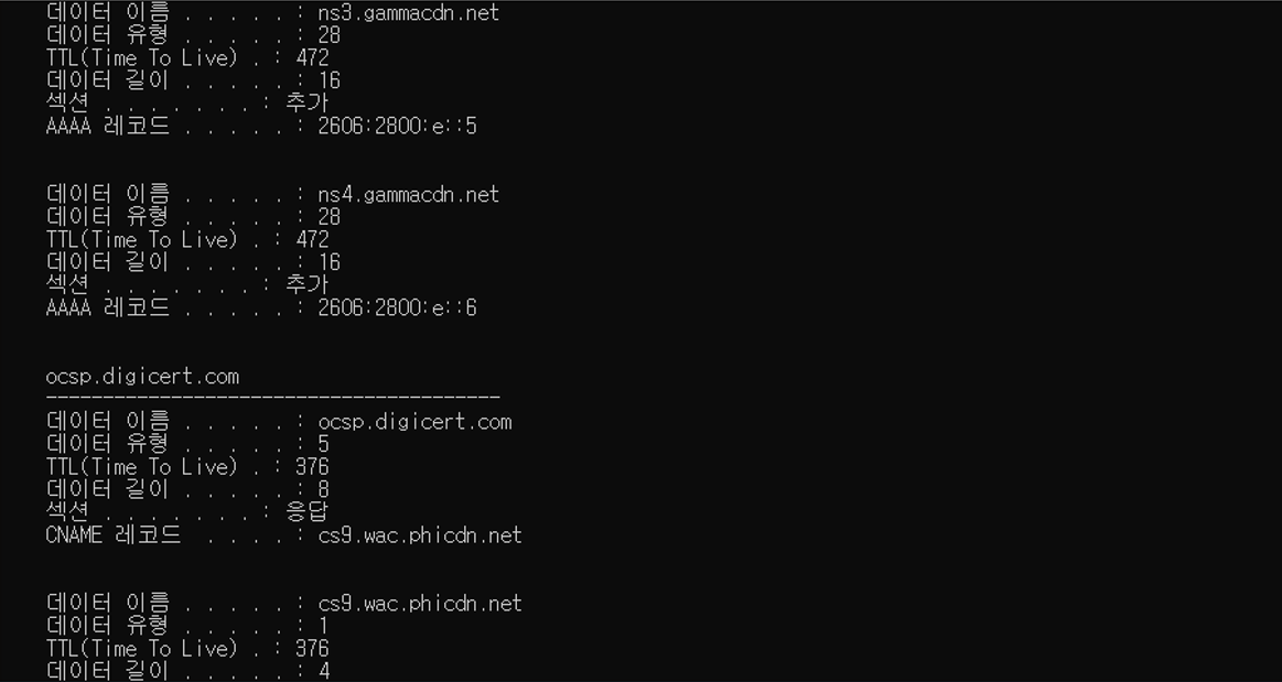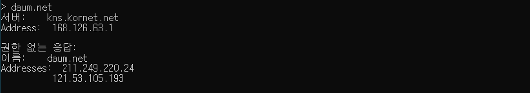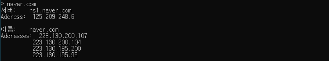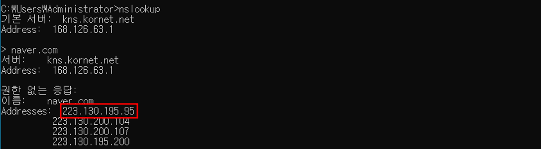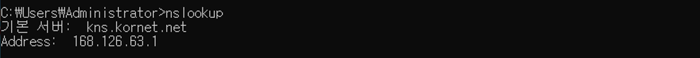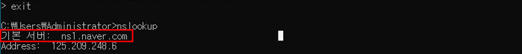 - exit로 해당 창 나온 뒤 다시 nslookup 접속 시 기본 서버가 네이버 서버로 바뀜