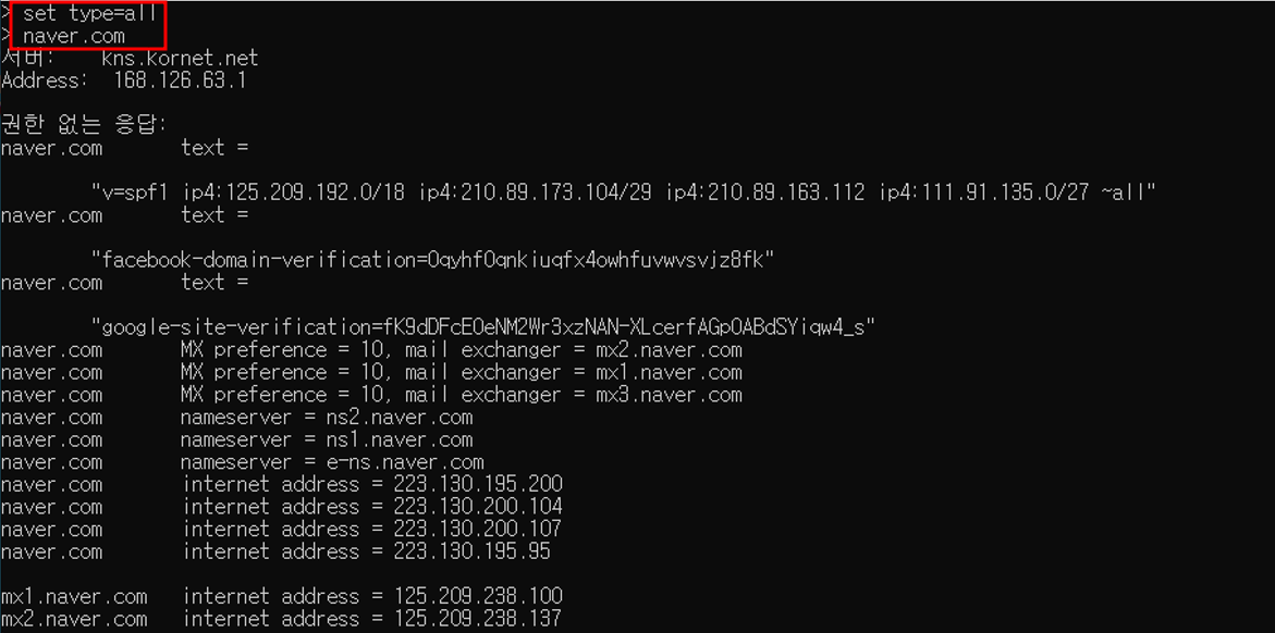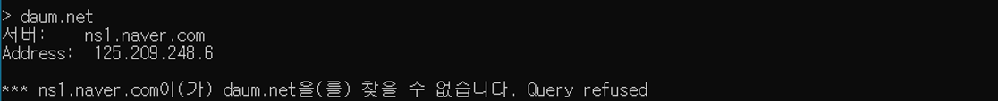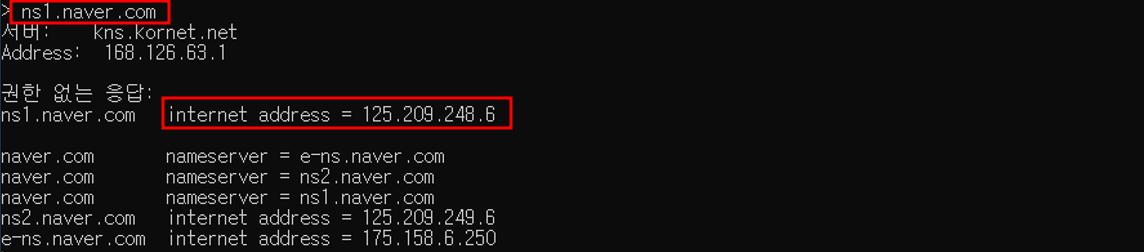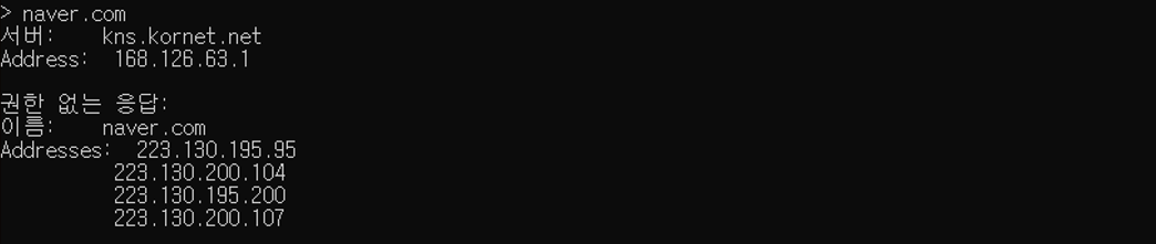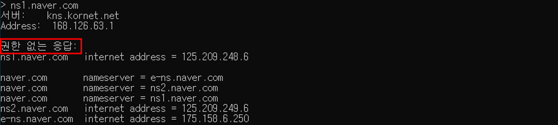 - 다른 DNS를 통해 naver.com을 검색하게 되면 권한 없는 응답이라는 메세지 출력