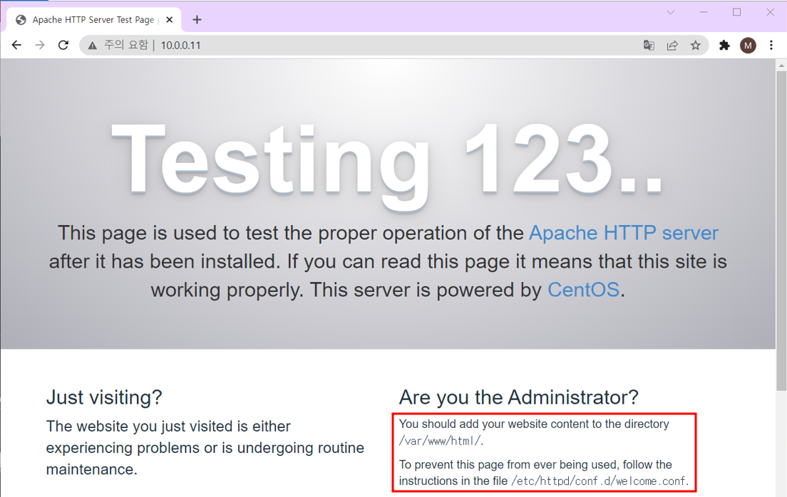 * 시작 페이지가 없다면 /etc/httpd/conf.d/welcome.conf. 파일 실행