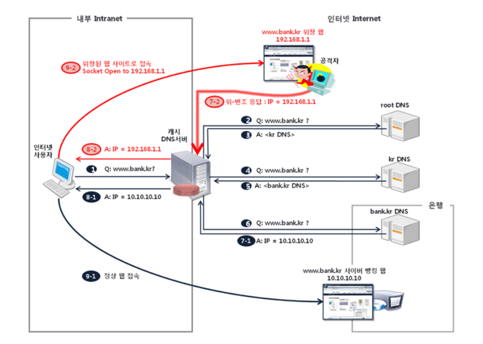 1. 인터넷 사용자가 캐시 DNS 서버에게 www.bank.kr 의 정보를 물어봅니다.
