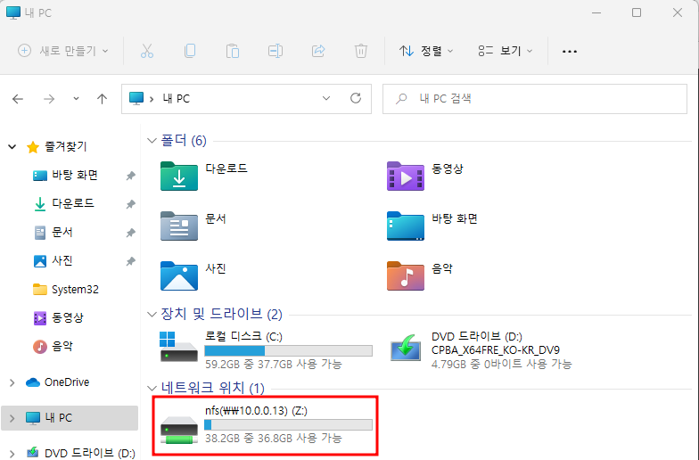 제어판 - 프로그램 및 기능 - Windows 기능 켜기/끄기 - NFS용 서비스 체크Windows client와 nfs server 마운트Windows client에서 마운트 된 드라이브 확인 가능windows clietn에서 파일 생성nfs server에서 windows client가 생성한 파일 확인 가능