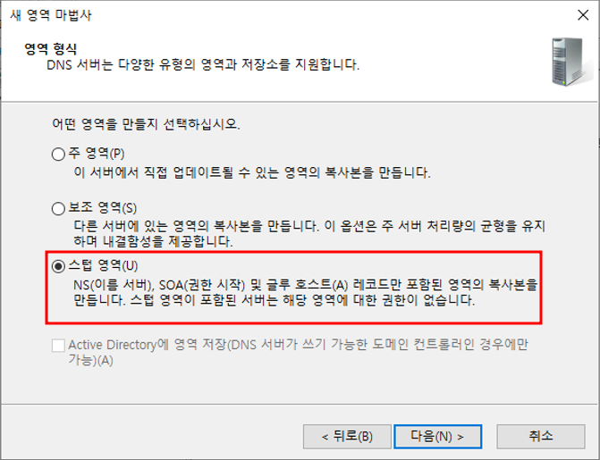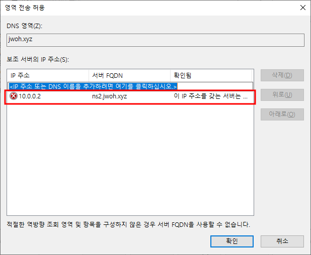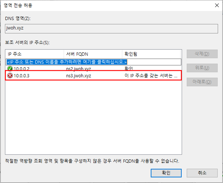 마스터 DNS의 정방향 조회 영역 우클릭 - 속성영역 전송 편집스텁 영역 추가스텁 영역 추가 완료