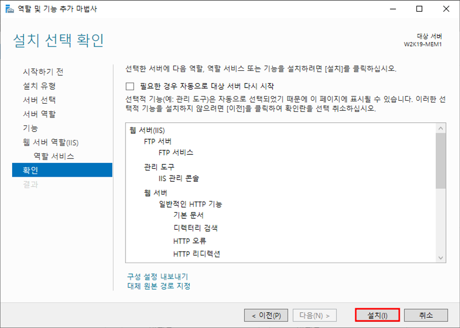 서버 관리자 - 관리 - 역할 및 기능 추가역할 기반 또는 기능 기반 설치웹 서버 추가FTP 서버 추가설치 완료서버 관리자 - 도구 - IIS 추가 확인 가능
