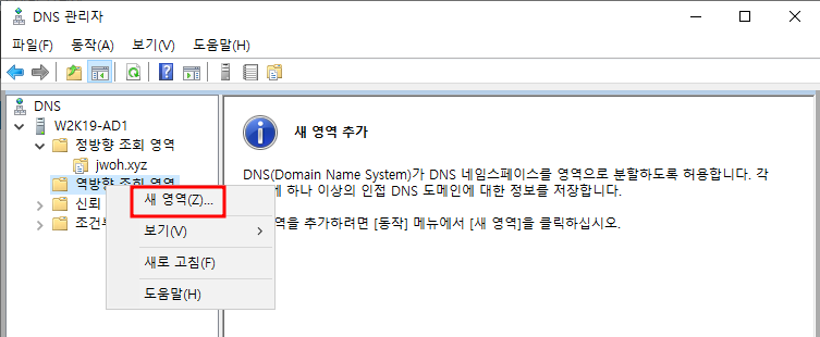 서버 관리자 - 도구 - DNSw2k19-mem1 우클릭 - 새 범위