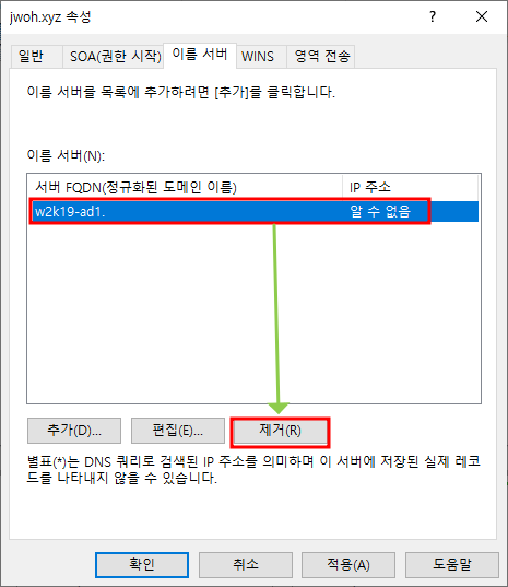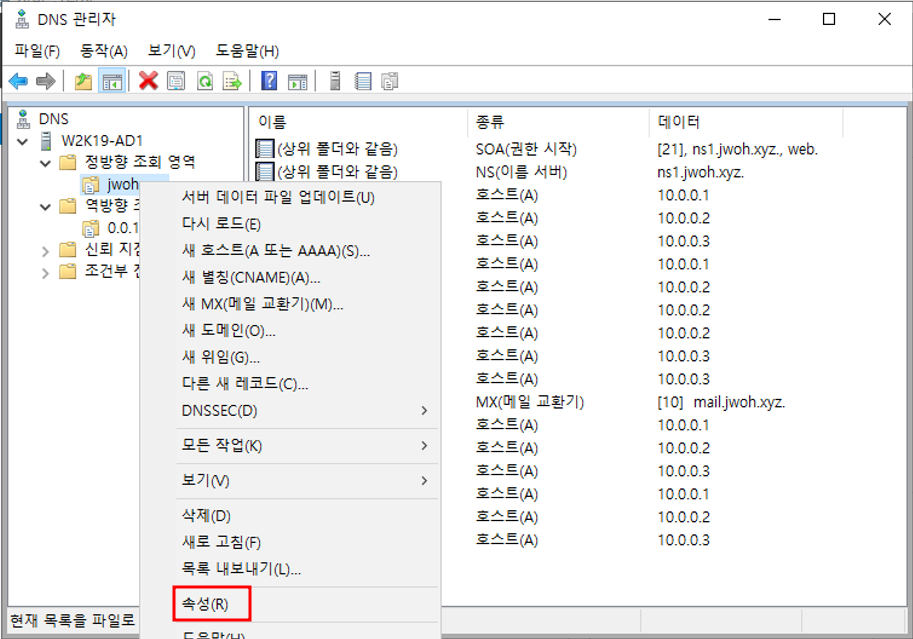 W2K19-AD1 서버의 정방향 조회 영여 우클릭 - 속성영역 전송 편집보조 DNS 서버(W2K19-MEM1) 추가보조 DNS 추가 완료