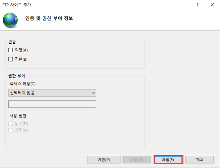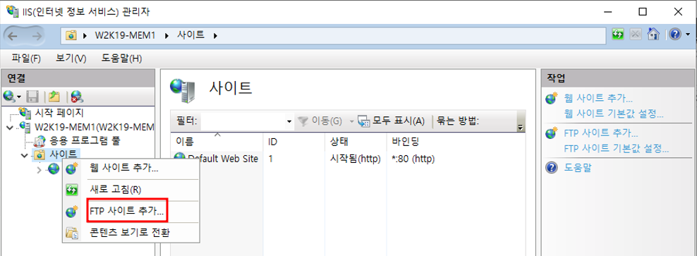 IIS 관리자 - 사이트 우클릭 - FTP 사이트 추가사이트 정보 추가실제 경로 추가 완료