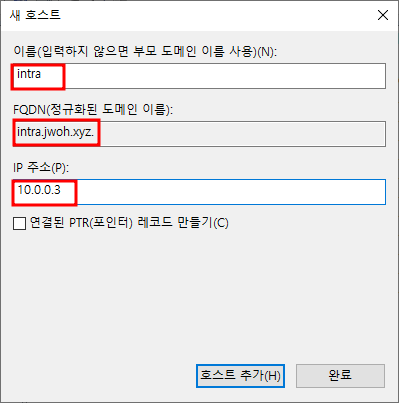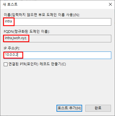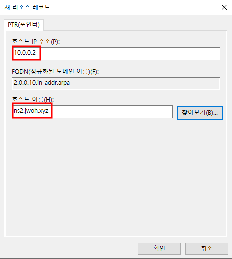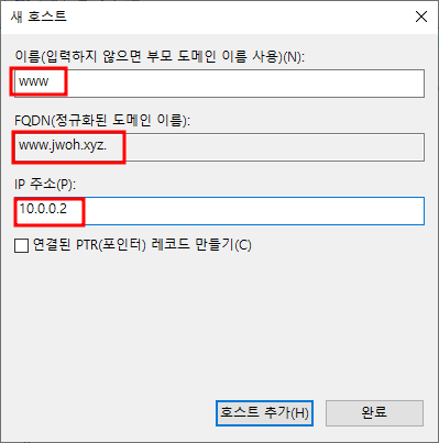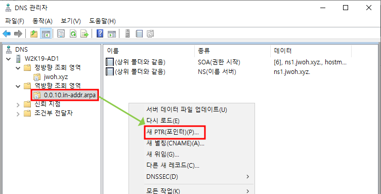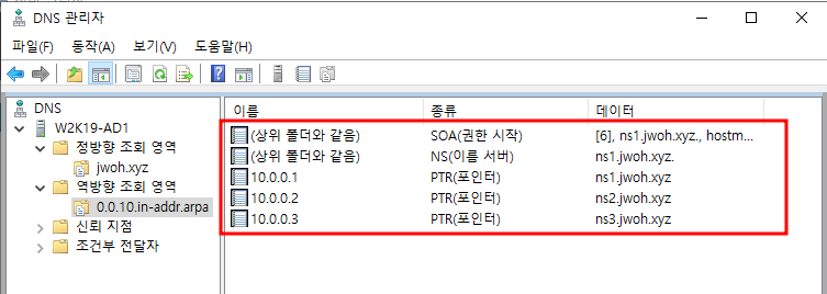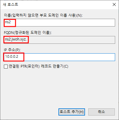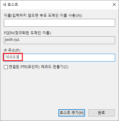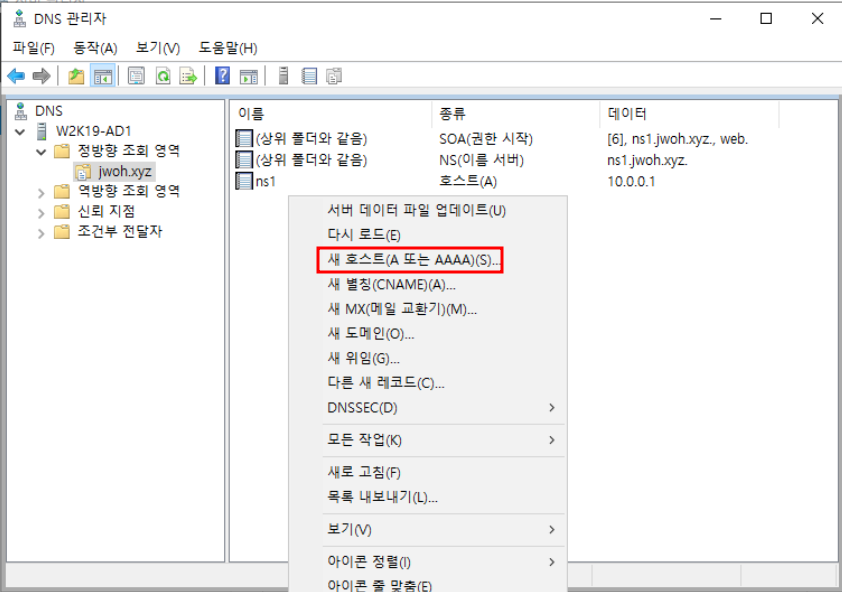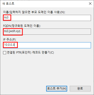 빈공간 우클릭 - 새 PTR10.0.0.1과 ns1 매칭설정 완료