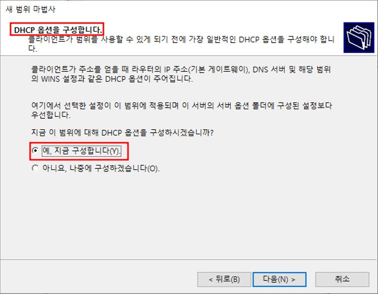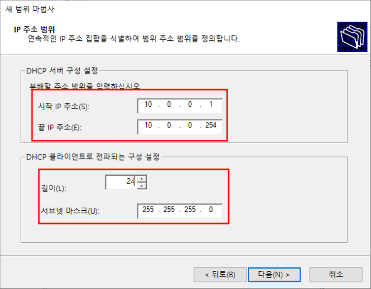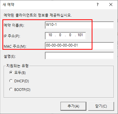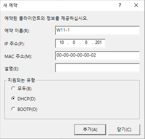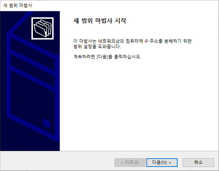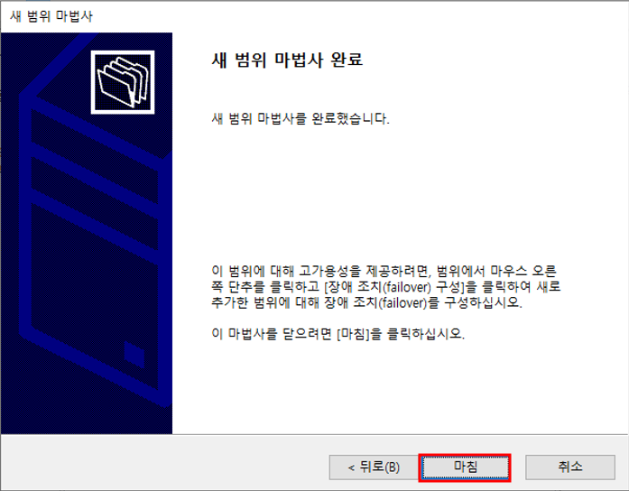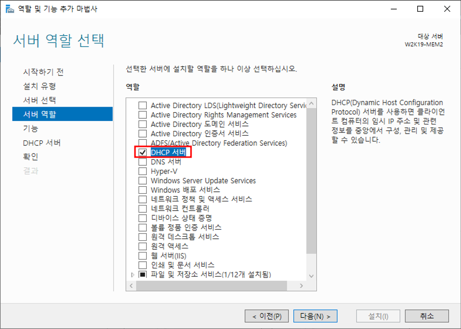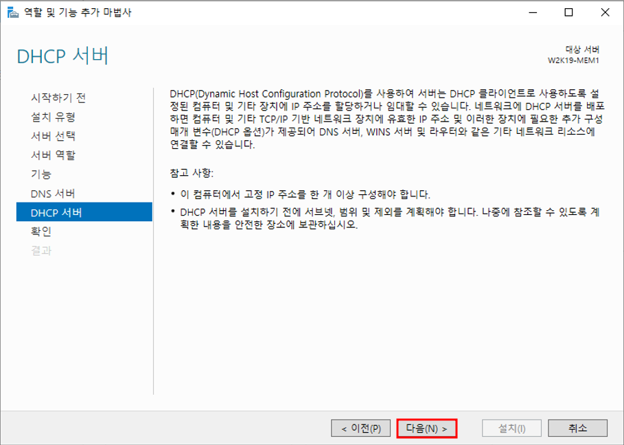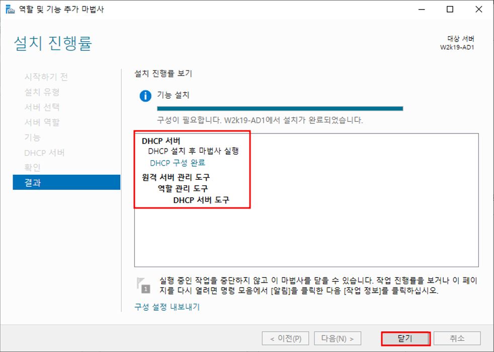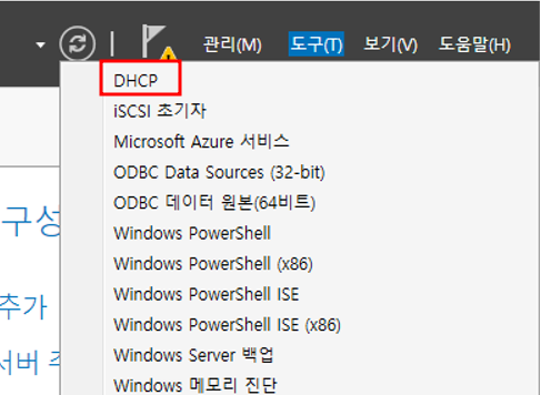서버관리자 - 관리 - 역할 및 기능 추가DHCP 기능 추가DHCP 서버 선택 완료설치 설택 전 확인설치 완료서버 관리자 - 도구 - DHCP 설치 완료