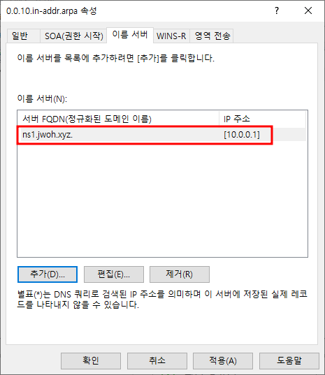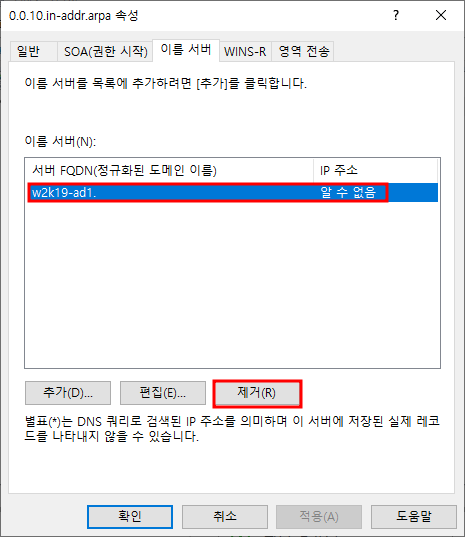 역방향 조회 영역 우클릭 - 속성영역 전송 편집보조 DNS(W2K19-MEM1) 추가보조 DNS 추가 완료