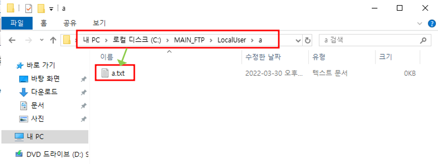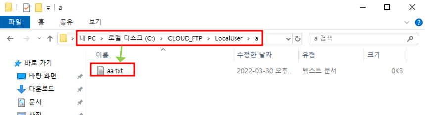 MAIN FTP 폴더 - LocalUser 폴더 - 사용자 a 폴더 아래에 a.txt 파일 생성MAIN FTP 폴더 - LocalUser 폴더 - 사용자 b 폴더 아래에 b.txt 파일 생성CLOUD FTP 폴더 - LocalUser 폴더 - 사용자 a 폴더 아래에 aa.txt 파일 생성CLOUD FTP 폴더 - LocalUser - 사용자 b 폴더 아래에 bb.txt 파일 생성