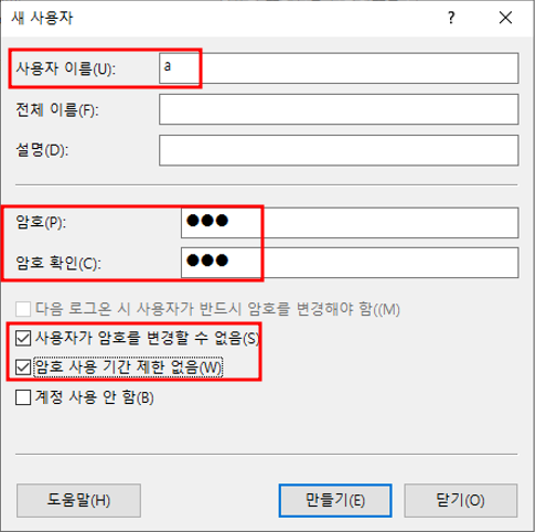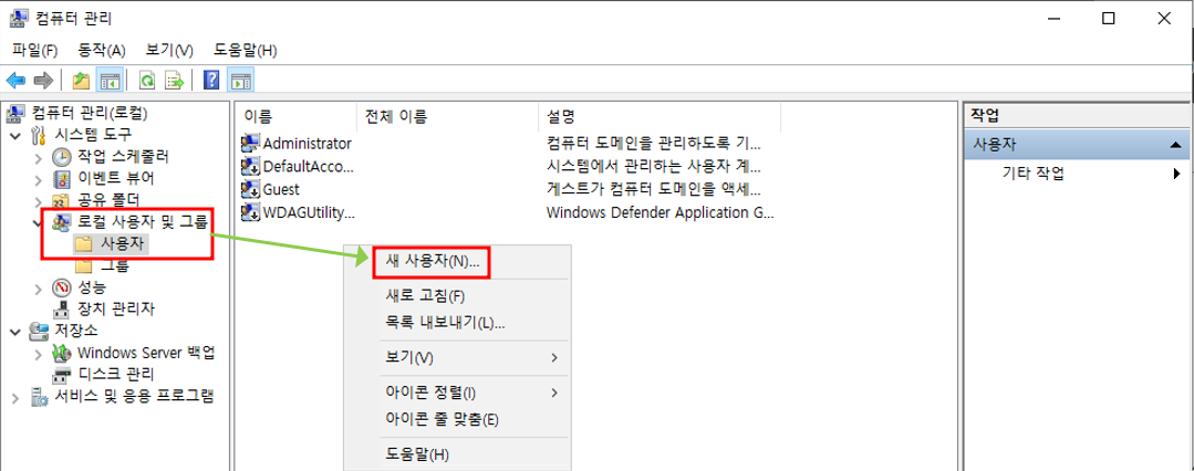 computer management 창 열기로컬 사용자 및 그룹 - 사용자 - 빈공간 우클릭 - 새 사용자