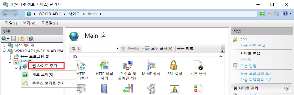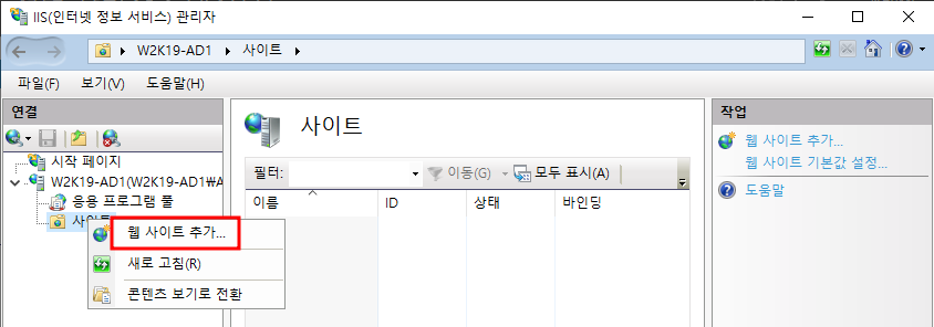 사이트 우클릭 - 웹 사이트 추가