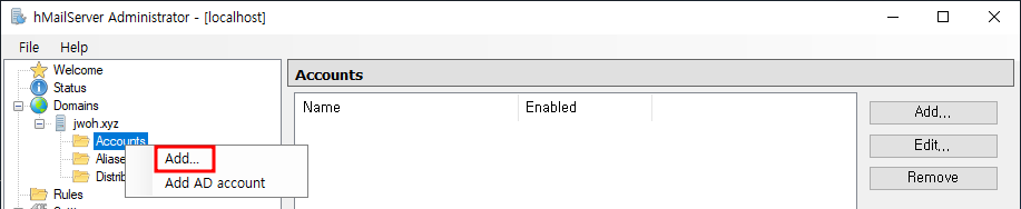 생성 된 도메인 하단의 Accounts 우클릭 - Add