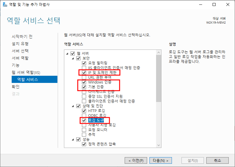 IP 및 도메인 제한, Windows 인증, 기본 인증, 로깅 도구 체크