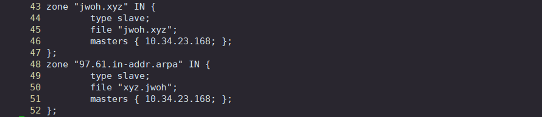 조회 영역 파일 열기정방향과 역방향의 도메인 네임, IP 작성 / 보조 DNS이기 때문에 slave type / 파일명 / 주 DNS 내부 IP 입력