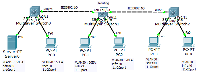 2. 가운데 스위치 설정(Trunk mode, Routed Port)