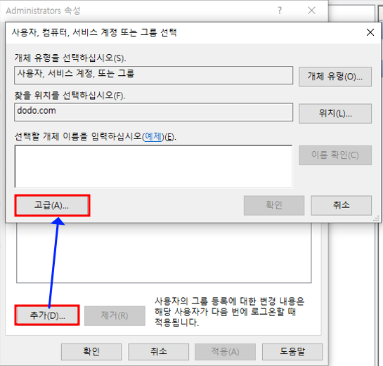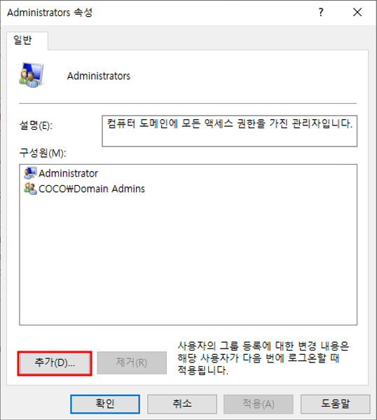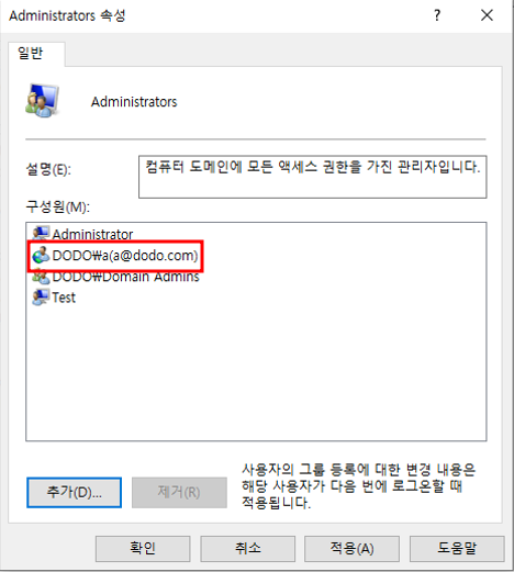* 도메인 컨트롤러에서 사용자 a를 adminstrators 그룹에 추가시키면 사용자 a는 모든 컴퓨터에서 관리자 권한을