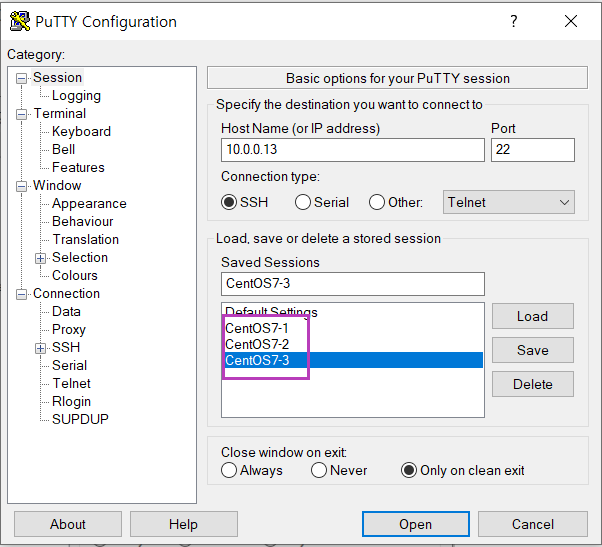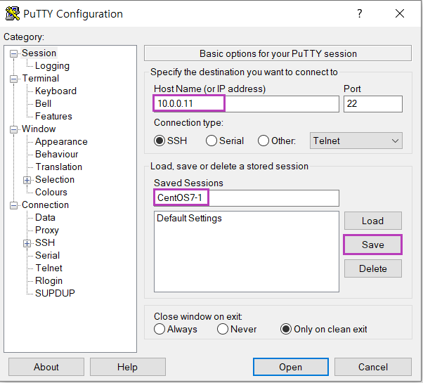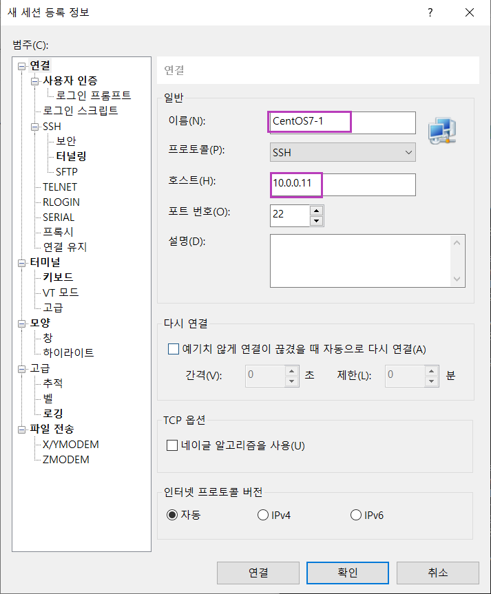 putty 설치 후 실행시켜 가상머신과 연결이 가능하도록 설정