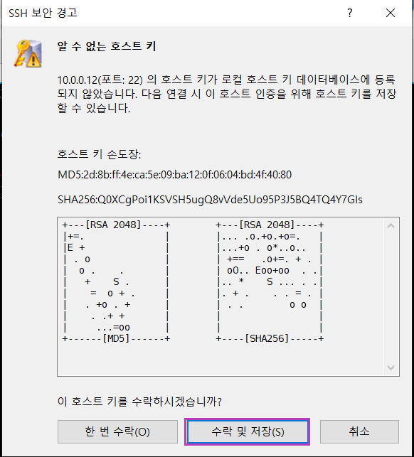 보안 경고 창이 뜨면 수락 및 저장 -> 한번만 하고 다음부터는 자동으로 접속 가능