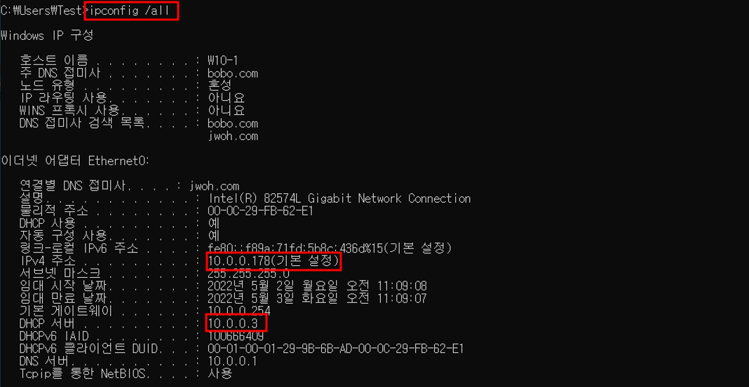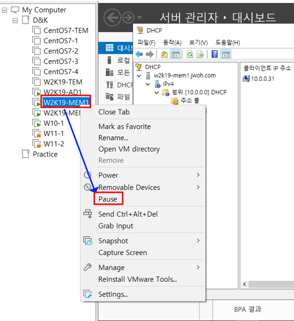 - DHCP는 기존의 IP를 계속 쓰려는 경향이 있기 때문에 메인 DHCP 서버의 일시정지를 해제한 후 다시 IP를