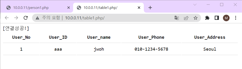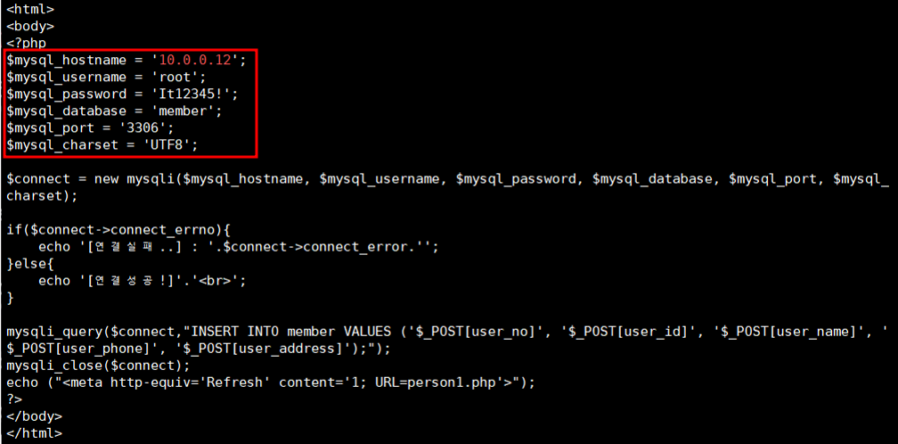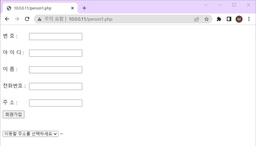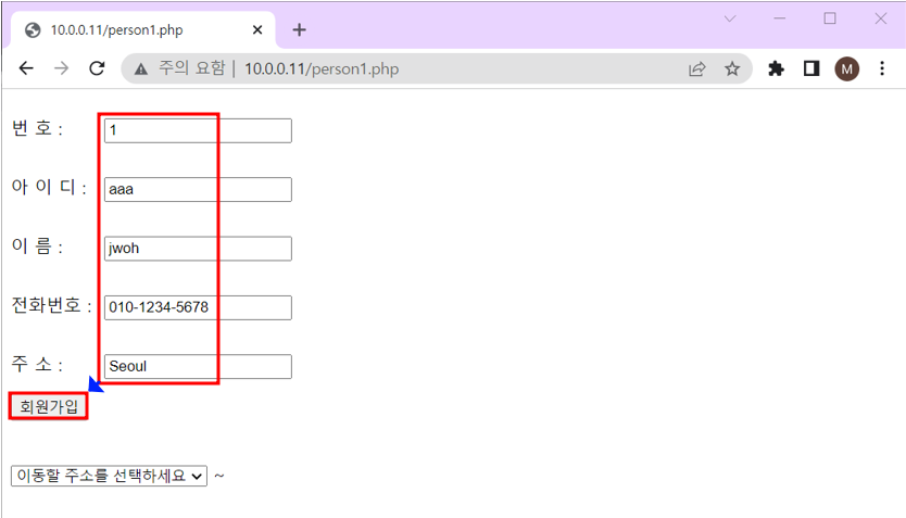 * person1.php에서 회원가입을 하면 insert1.php가 동작하여 DB에 데이터를 밀어넣음