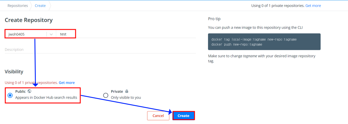 1. hub.docker.com에 회원가입 후 Repositories 생성