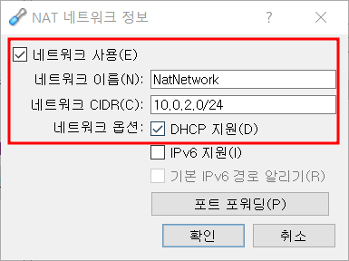 - 어댑터 1 NAT를 NAT 네트워크로 변경