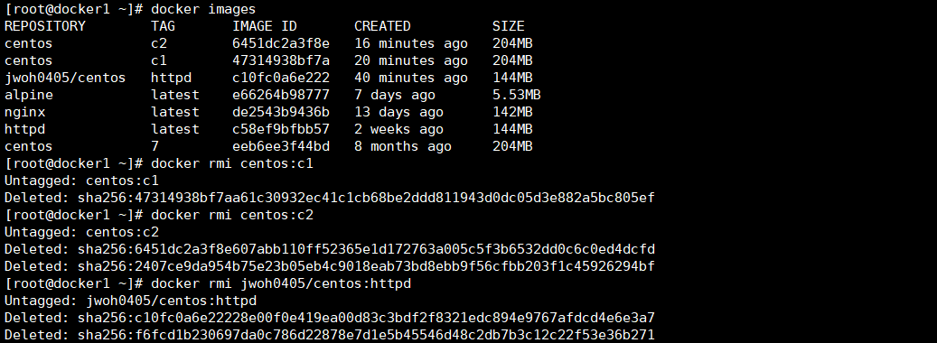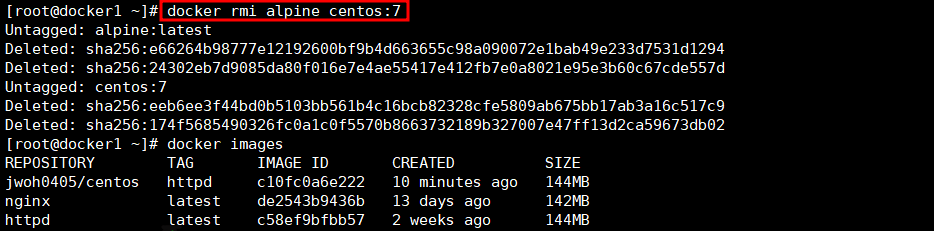 - 다운받은 이미지 삭제(httpd, nginx, alpine, centos7)