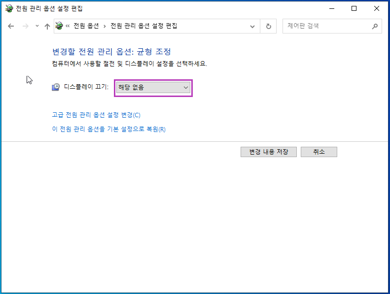 디스플레이 끄기를 해당 없음으로 변경 후에 변경 내용을 저장해줍니다