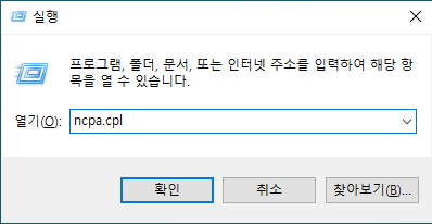 실행창에서 ncpa.cpl 을 입력하여 IP 설정 창 열어줍니다