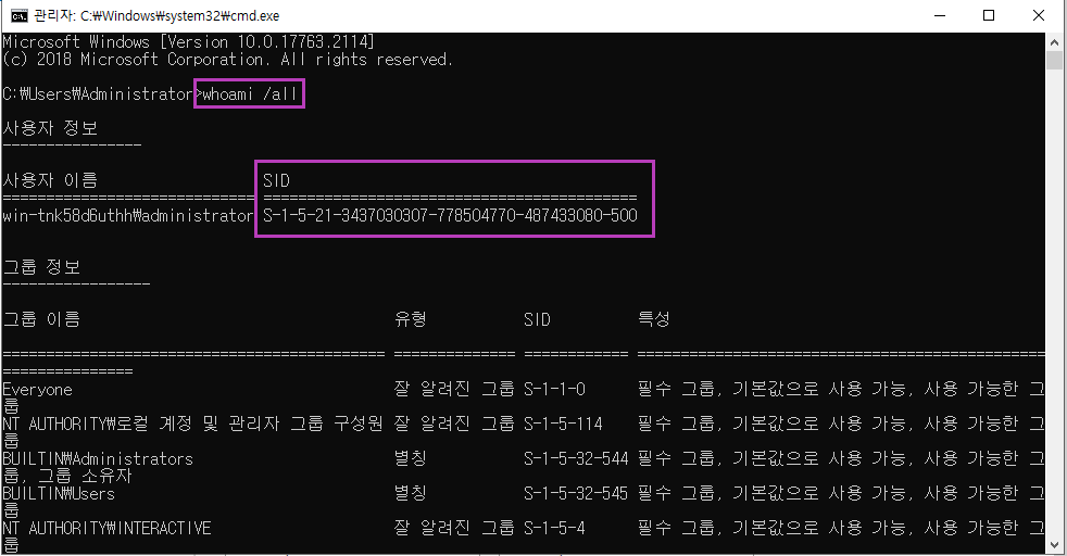 whoami /all 명령어를 통해 SID 값을 확인 가능합니다
