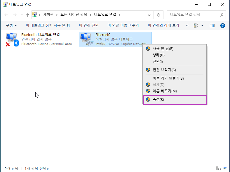 Ethernet0을 오른쪽 마우스 클릭 후 속성을 클릭해줍니다